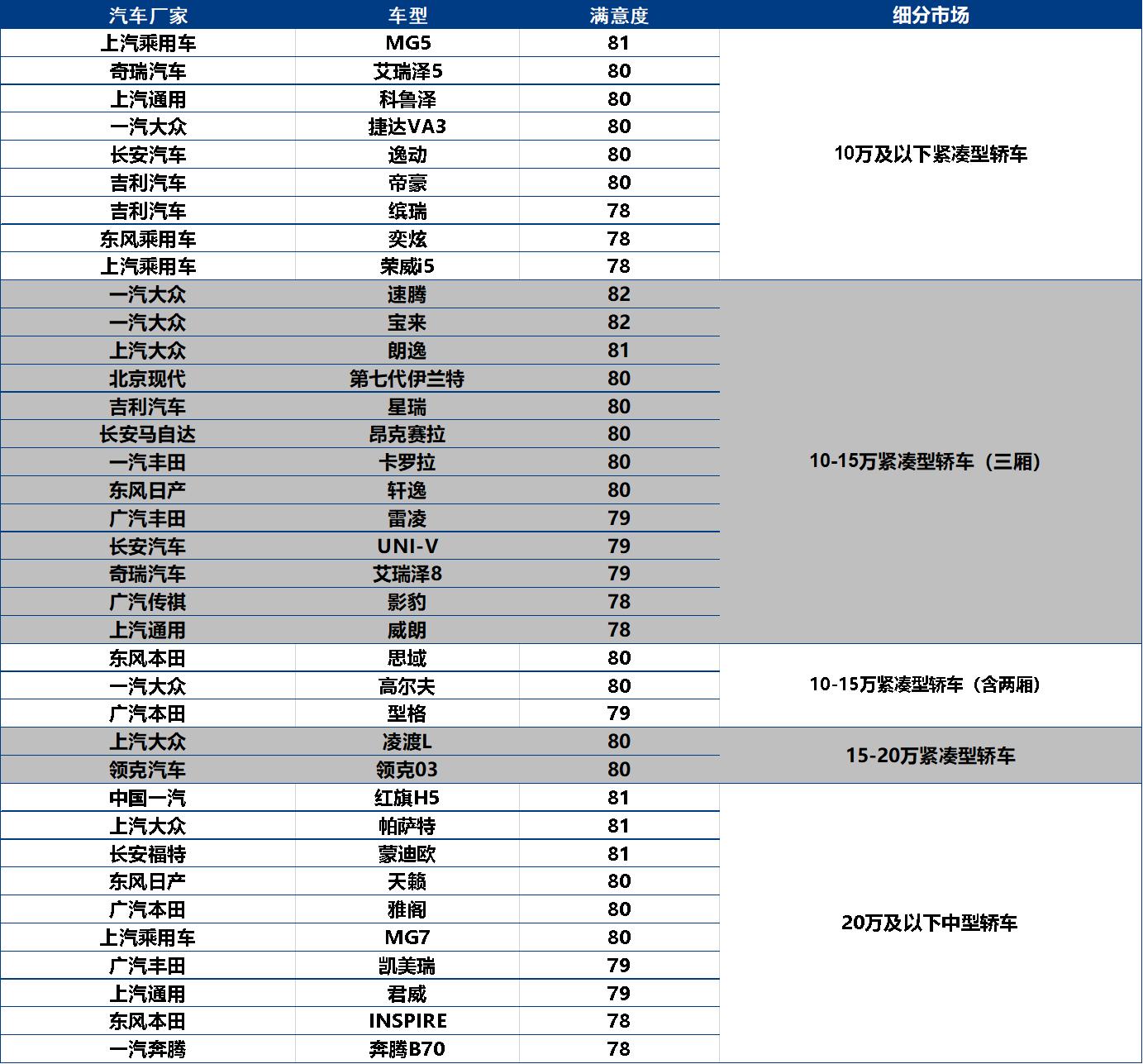 以价格、发动机排量和轴距综合划分细分市场车型,各细分市场CACSI第一(含并列第一)的车型是: