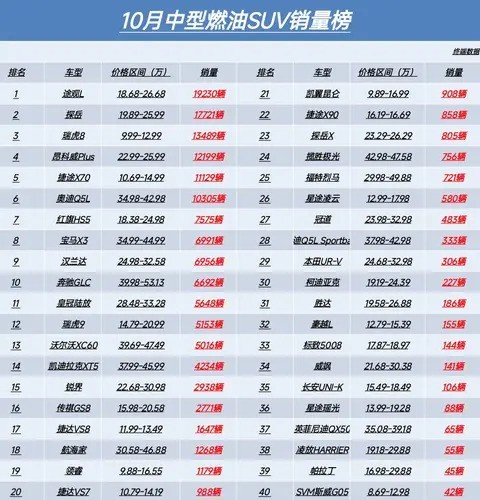 国内汽车市场竞争愈发激烈,新车型层出不穷,市场格局持续演变。最新公布的10月中型燃油SUV销量数据显示,多款主流车型表现亮眼。其中,瑞虎8、红旗HS5、汉兰达、瑞虎9以及沃尔沃XC60等车型销量位居前列。瑞虎8与汉兰达表现尤为突出,月销量均突破6956辆。此外,瑞虎9位列第12名,捷达VS8排在第17位,捷达VS7则位居第20名。