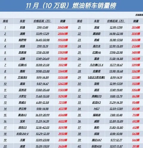 本文属于原创文章,如若转载,请注明来源:2025年11月十万级燃油轿车销量出炉:速腾雅阁领跑,头部阵营稳固https://auto.zol.com.cn/1104/11042879.html