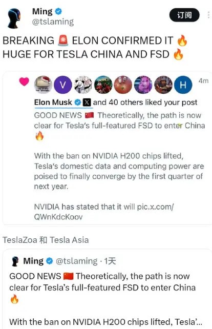 近日,一位海外博主在社交平台发布消息称,特斯拉完全自动驾驶功能进入中国市场的技术路径已基本明确,并获得公司首席执行官埃隆·马斯克的公开认可。该消息指出,随着英伟达H200芯片对华供应限制的解除,特斯拉有望在2026年第一季度实现本地数据与计算资源的闭环整合,为自动驾驶系统在中国的全面部署扫清关键技术障碍。