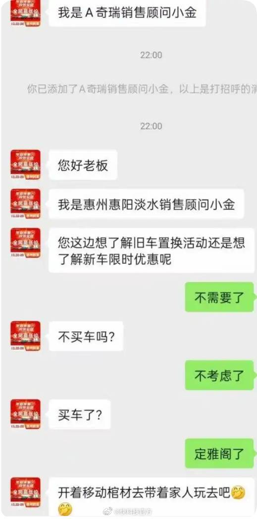 近日,广东惠州一家奇瑞汽车授权经销商因旗下销售人员的不当沟通行为引发公众关注。据反映,该店一名销售顾问在添加客户为好友后,持续向其推介旧车置换与新车限时促销等业务。面对此情况,消费者已多次通过“不需要了”“不考虑了”等明确表述予以拒绝,并告知对方已决定购买其他品牌车型。然而,该销售顾问仍发送“开着移动棺材去带着家人玩去吧”等不当言辞,令消费者感到被冒犯,情绪受到伤害。