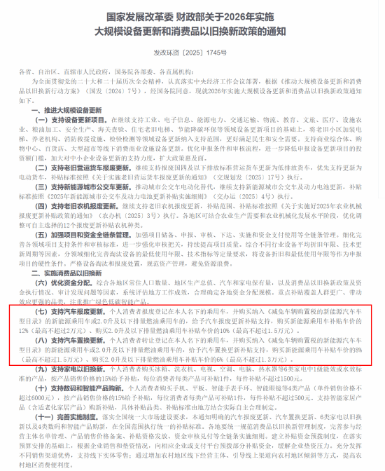 国家发展改革委与财政部联合发布通知,宣布将于2026年推行新一轮大规模设备更新及消费品以旧换新政策。根据政策安排,汽车报废与置换更新将成为重点支持方向。
