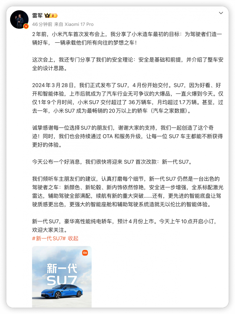 2026年4月,全新一代SU7即将正式上市,今日上午10点开启小订。此次新车将带来全新“卡布里蓝”配色,进一步丰富用户的个性化选择。
