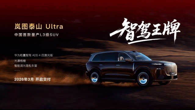 2026年1月28日,岚图汽车在年终媒体答谢会上宣布,岚图泰山Ultra将于今年3月正式开启交付。作为岚图汽车冲击L3赛道的重磅产品,岚图泰山Ultra完全按照L3级自动驾驶架构设计,并搭载最新的华为乾崑智驾四激光方案。