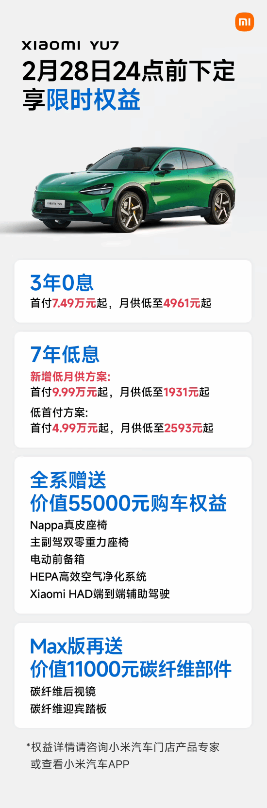 本文属于原创文章,如若转载,请注明来源:小米YU7推7年低息+3年0息双金融方案,首付低至4.99万元https://auto.zol.com.cn/1129/11294331.html