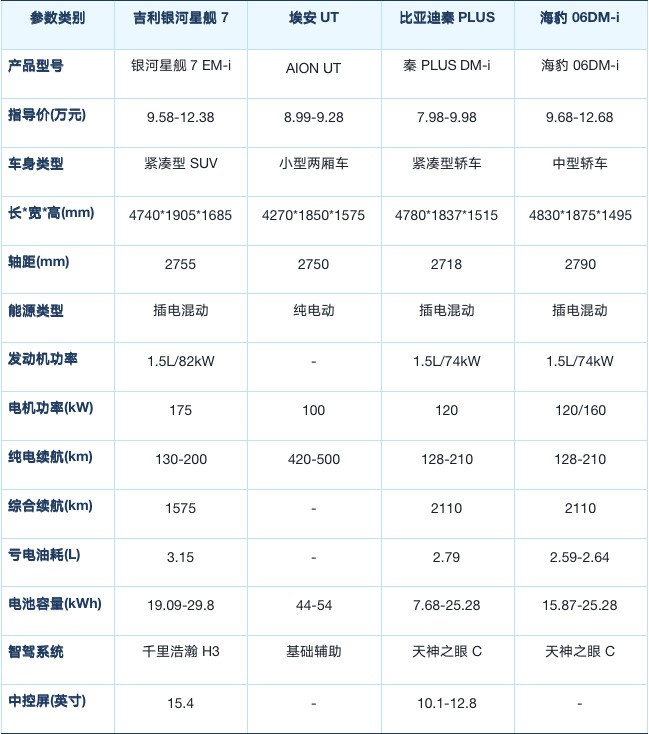 四款车型各有侧重,精准覆盖不同需求:银河星舰7 EM-i主打大空间、长续航与高智能,适配偏爱SUV的家庭;埃安UT以低价高续航,成为城市通勤优选;秦PLUS DM-i凭借超低起售价与超长综合续航,性价比突出;海豹06 DM-i以中型车定位与丰富配置,满足高品质出行需求。