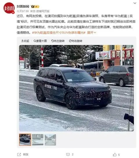 近日,一组关于奕境汽车首款车型的冬季路试谍照在网络上流传。该车由东风与华为乾崑联合开发,定位为大型智能电动SUV,计划于2026年4月在北京车展正式亮相。