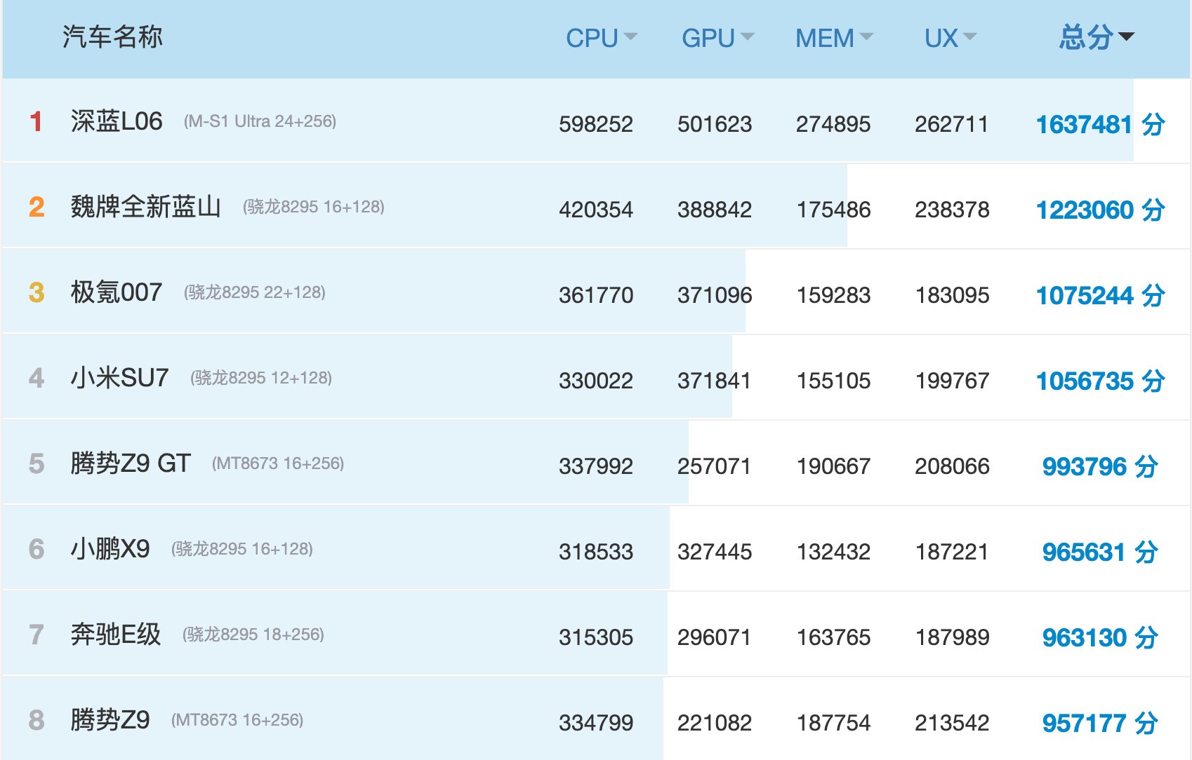 榜单中,深蓝L06以总分1,637,481分的绝对优势登顶,其搭载的M-S1Ultra芯片在各项测试中均展现出碾压级表现: