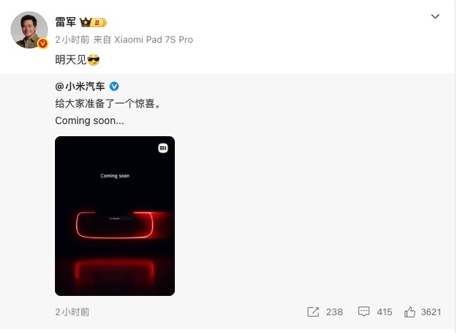 二月二十八日,小米汽车通过官方社交媒体平台发布一张新车预告海报,配文“给大家准备了一个惊喜。Coming soon……”。小米集团创始人、董事长兼首席执行官雷军同步转发该消息,并明确表示“明天见”。