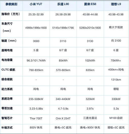 综上所述,小米YU7、乐道L90、蔚来ES8和理想L9这四款车型各有千秋,分别适合不同需求的消费者。小米YU7以其超高的性价比、超长续航和丰富的智能化配置,成为25万级市场的性价比之选;乐道L90凭借超大的空间利用率和换电便利性,成为家庭用户的实用之选;蔚来ES8以其奢华配置和完善的服务体系,成为高端市场的品质之选;理想L9则凭借增程技术解决了里程焦虑,成为长途出行的可靠之选。