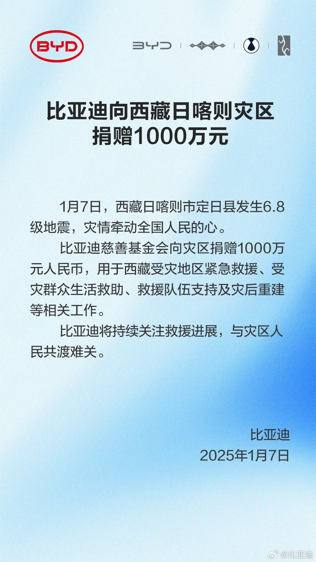 比亚迪官方宣布,比亚迪慈善基金会向西藏日喀则灾区捐赠1000万元人民币,为西藏受灾地区紧急救援,以及灾后重建提供帮助,比亚迪将持续关注救援进展,与灾区人民共渡难关。